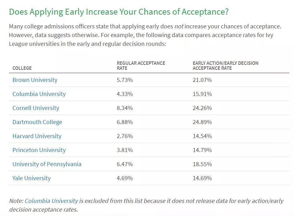 最通常的理解是EA/ED有更高的录取率,所以早申被录取的可能性比正常申请要大。请看下面一组统计数据。拿大多数人的梦想校哈佛来说,EA/ED的录取率是RD的五倍。数据来源:https://www.niche.com/